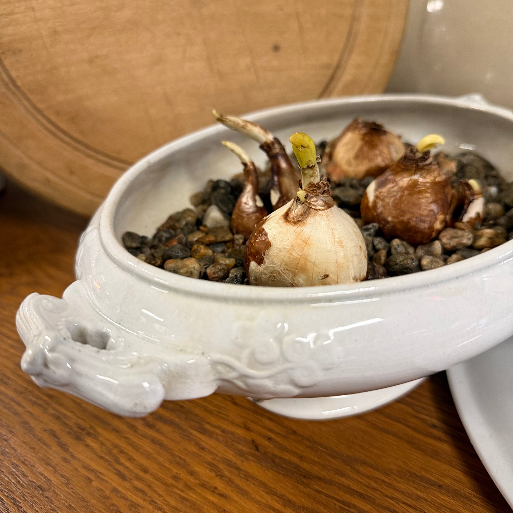 Oval clover pattern Cockson & Seddon ironstone covered dish/tureen planted with four paper white bulbs.